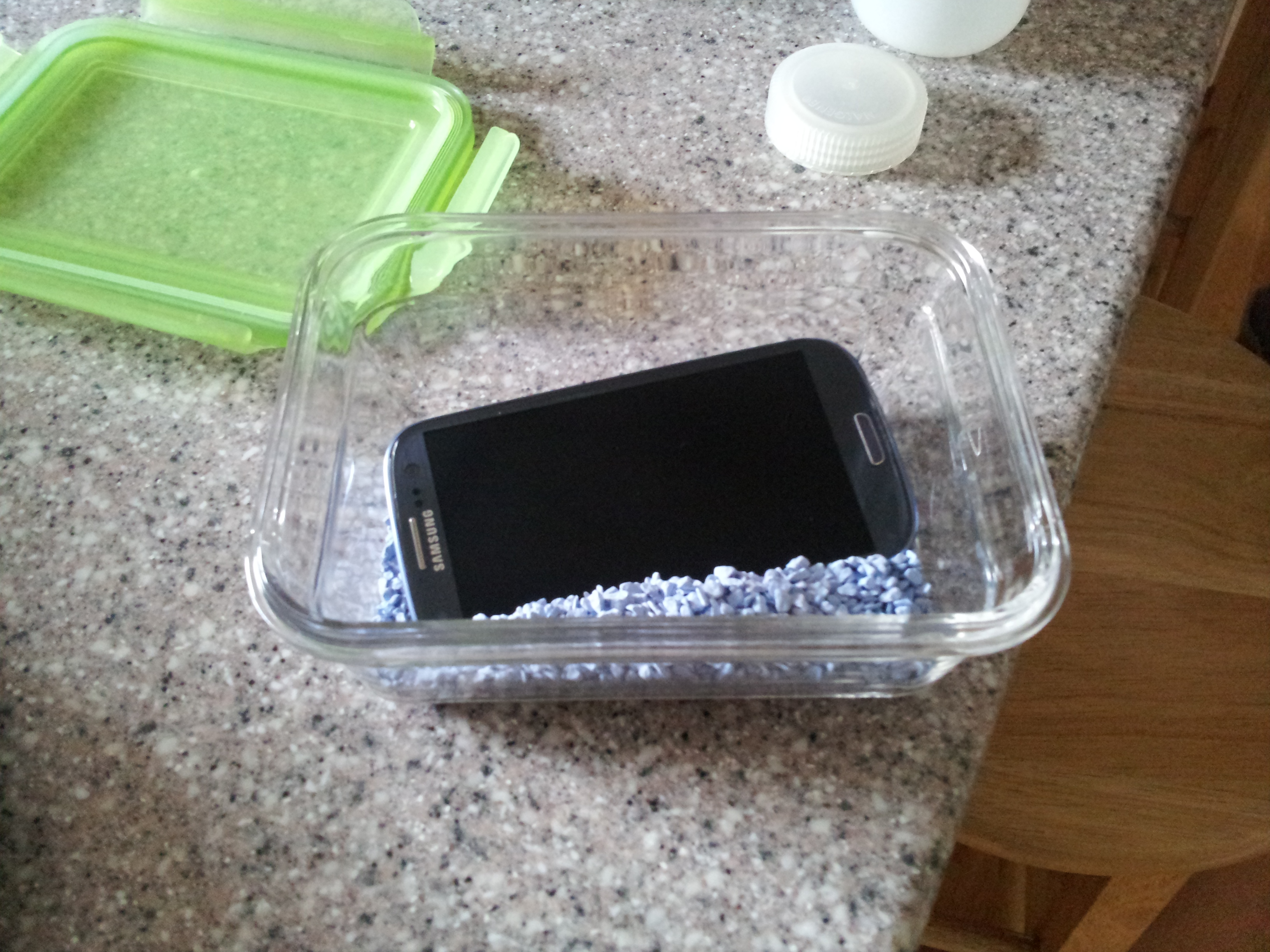 After 2 days in a bag of dry rice Jeney found some dessicant at her lab that she thought would work better than the rice. She brought it home and we put our phones in. 24 hours later I have a working phone! I can hardly believe that it is still working – I was probably in the pool for at least a few minutes before I realized the phone was in my pocket! I believe the dessicant is called Drierite. If you ever get your phone completely soaked I recommend finding some of this stuff, or something like it to help dry your phone out after you disassemble it. We honestly got pretty lucky, we both had tried plugging our phones in and turning them on, which is a big no-no with wet phones. Jeney’s is still drying out – after trying to turn it on this morning it began to “boot” and then black screened. We’re holding out hope that another day of drying will see it working again!