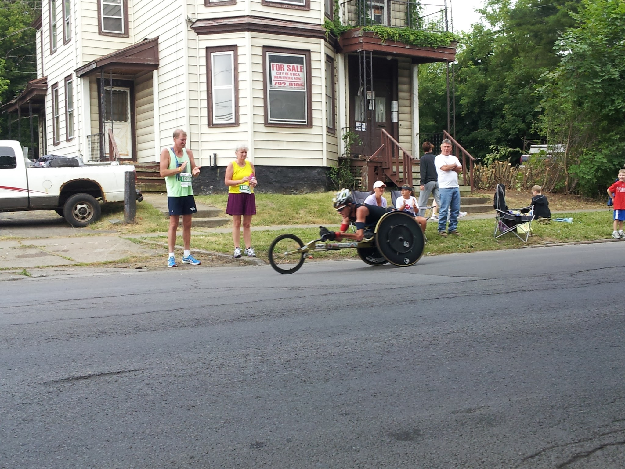 After our 5k we found some grass on the side of the road and joined the thousands of people lining the roads of the course to watch the 15k runners. I managed to snap a picture of the 1st place finisher, Tilahun Regassa, from Ethiopia – so impressive to see these world class athletes running! His mile pace was 4:37! In addition to the top runners, there were several racing wheelchair racers – that is some serious upper body strength to do 9 miles with your arms.